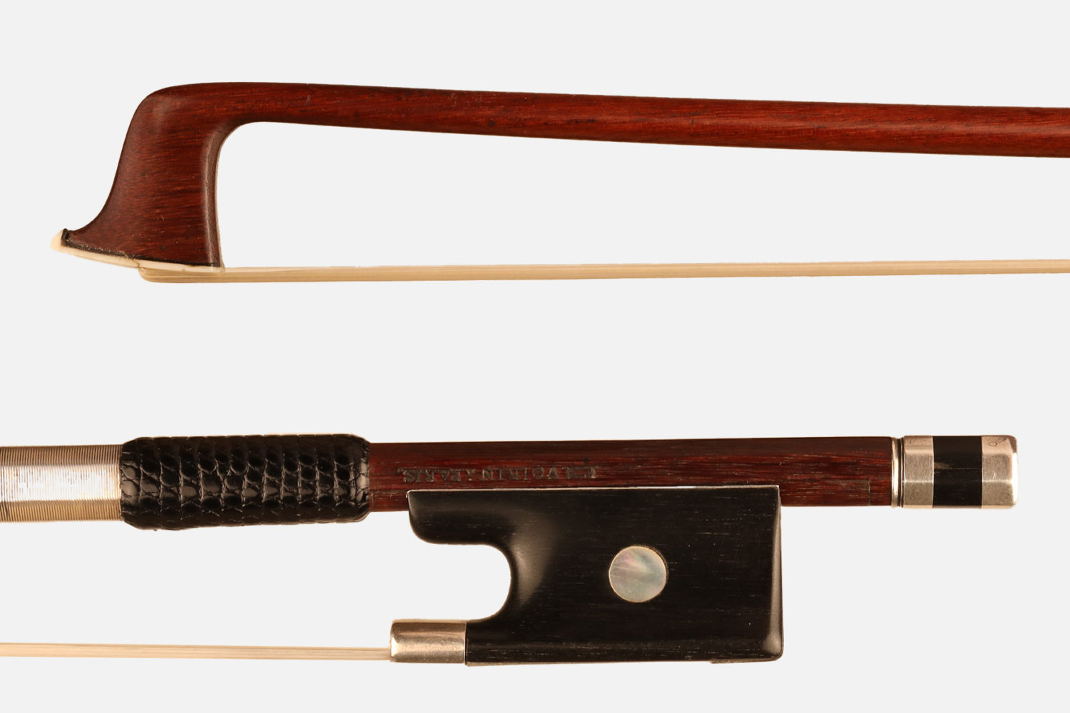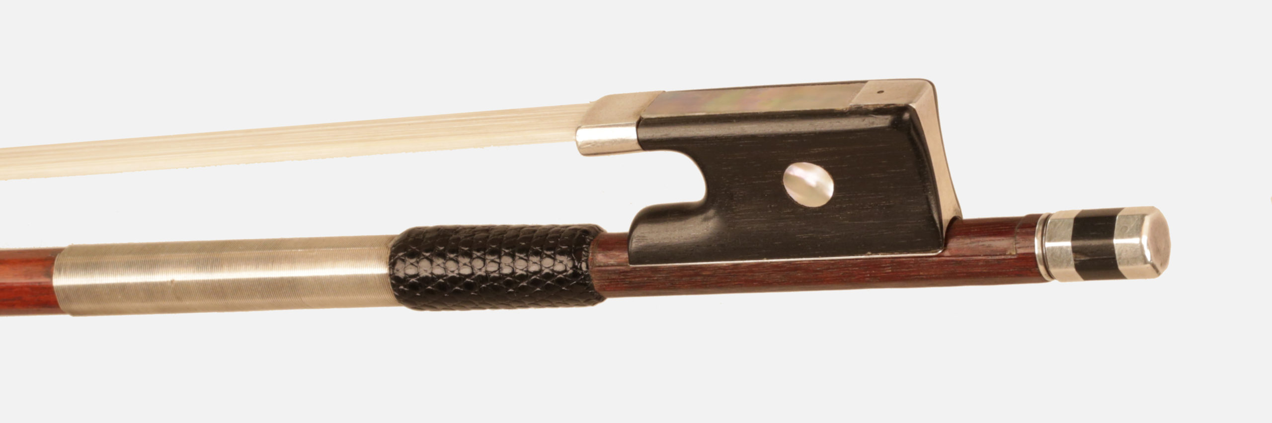 Pernambuco wood, round, silver mounted, the ebony frog with pearl eyes, the adjuster with 2 silver bands. Vuillaume model.