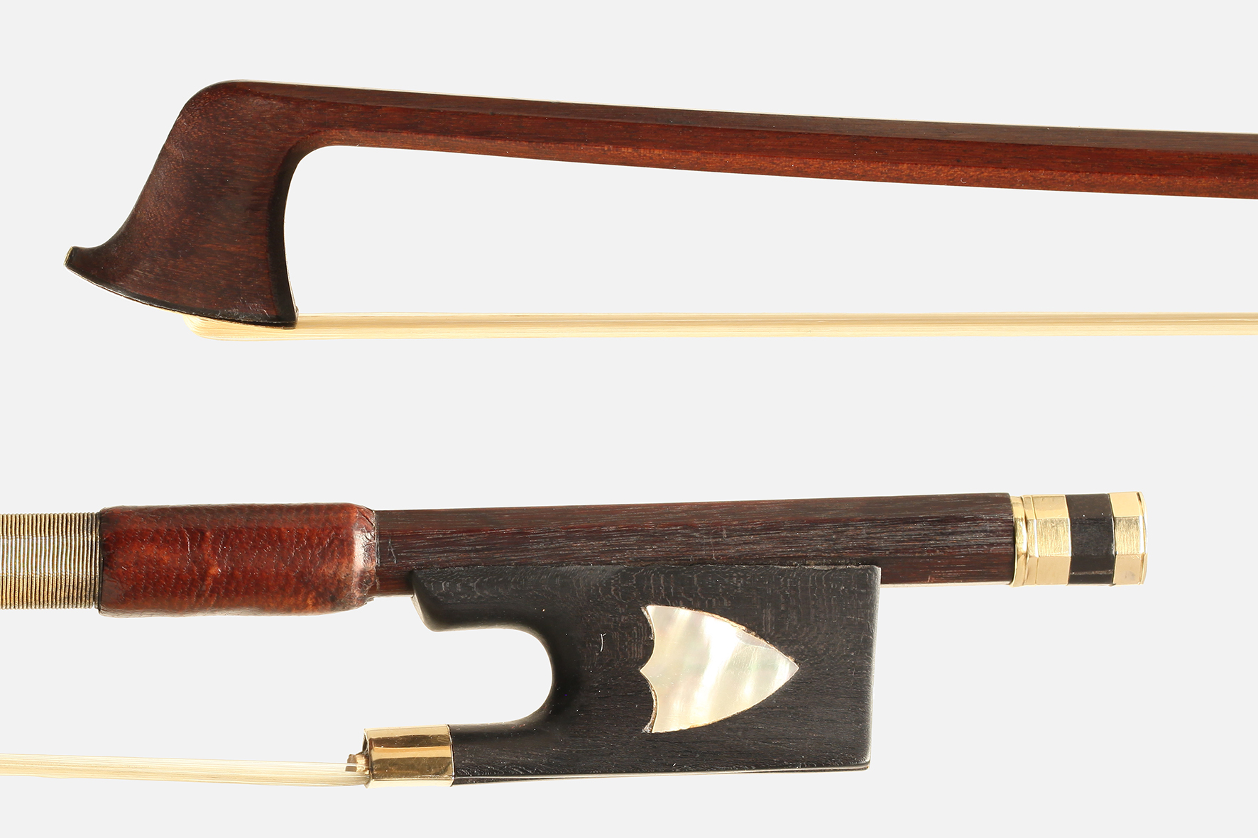 Pernambuco wood, octagonal, gold mounted, the ebony frog with 2 mother of pearl shields, the adjuster with 2 gold bands. Good state of restoration.