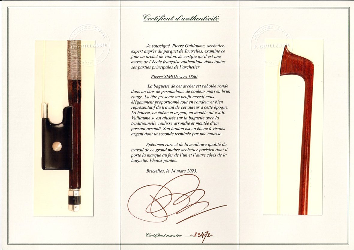 泥瓦匠的儿子,皮埃尔.西蒙在其出生的城市学习了制造琴弓的技艺,并在1838年来到巴黎在多米尼克.皮卡身边工作了两年时间。之后在1840年由VUILLAUME雇用,并在1844年开建自己的独立工作坊。大约于1851年,他与乔瑟夫.亨利有过短暂的合作。从1852直至其去世,皮埃尔一直为VUILLAUME和格朗工作。他可能在此期间回过米尔谷。出自西蒙的琴弓作品是19世纪最伟大的作品之一。他的琴架同样出名,被称之为《花篮》,因其被精细雕刻的金银花装点。他的琴弓作品同样也因此精致外观而深受喜爱。